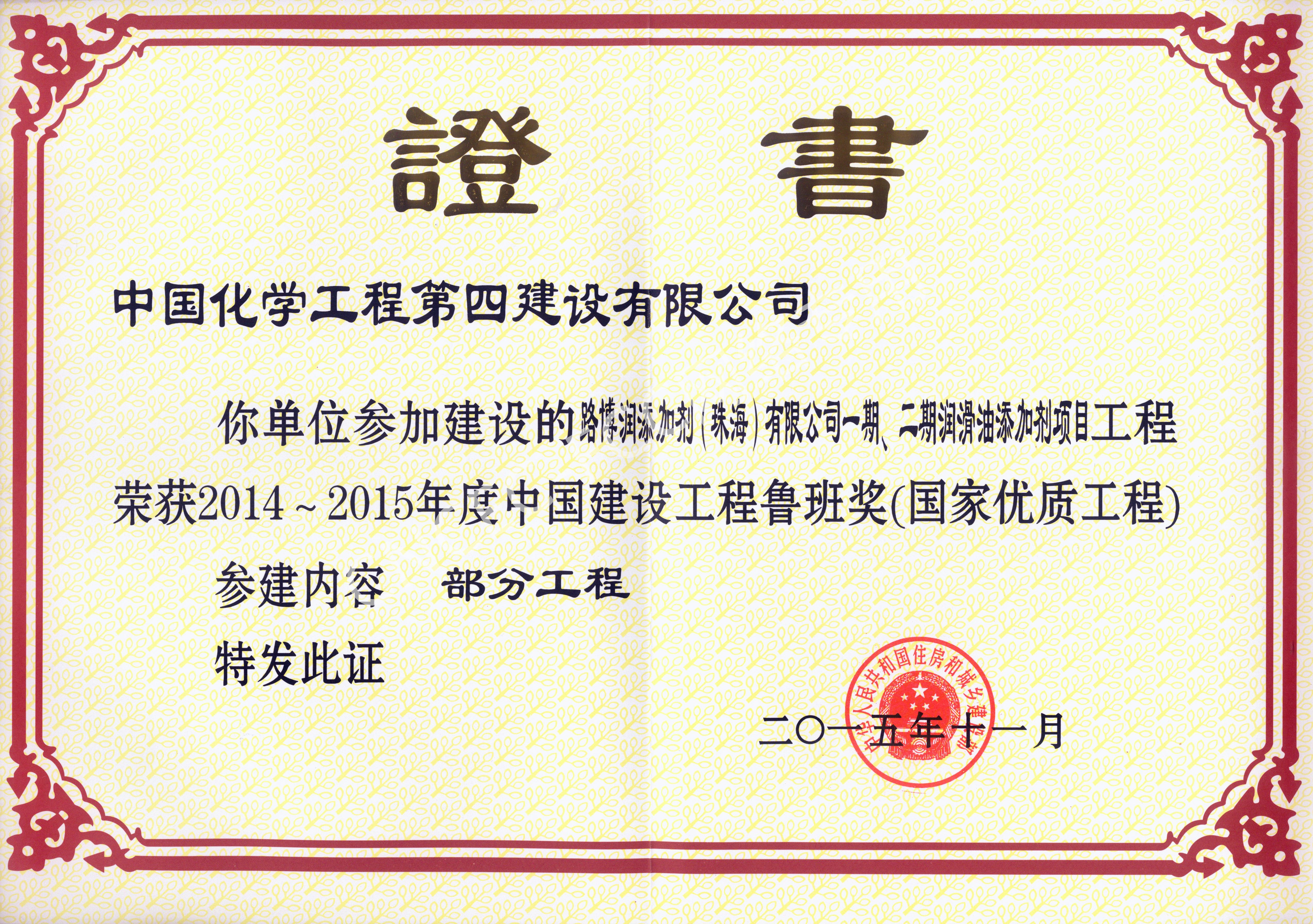 路博潤(rùn)添加劑(珠海)有限公司一期、二期潤(rùn)滑油添加劑項(xiàng)目中國(guó)建設(shè)工程魯班獎(jiǎng)