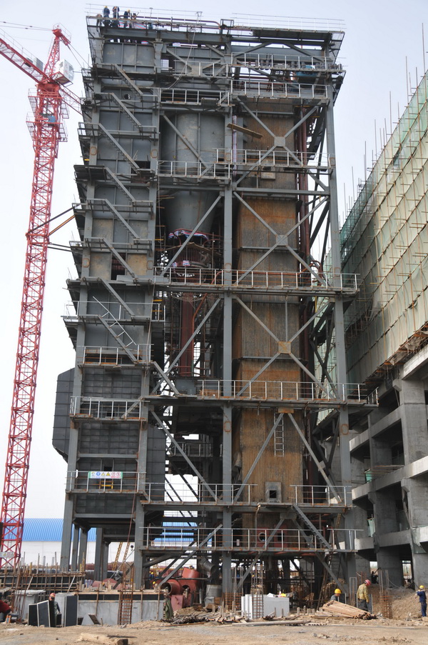 由一處平頂山項目部承建的平煤集團聯合鹽化有限責任公司120萬噸/年配套2×130t/h循環流化床鍋爐供熱安裝工程,經過100多天的日夜奮戰,于5月1日水壓試驗一次成功。該工程為平煤集團聯合鹽化有限責任公司重點項目。130T/H硫化床鍋爐為室外布置,由前部及尾部兩個豎井煙道組成。前部豎井為懸吊結構,四壁由膜式水冷壁組成,自下而上依次為硫化床、風室、水平通道。尾部豎中采用支承結構,自上而下布置有高溫過熱器、低溫過熱器、省煤器及空氣預熱器。兩豎井之間由水冷式旋風分離器相連通,分離器下部接回送裝置返料器。燃燒室及分離器內部均設有防磨內襯,前部豎井采用敷管爐墻,外置金屬護板,由吊掛裝置承受鍋爐全部重量。鍋爐運轉層在8米層,主蒸汽管道為φ273,施工難度非常高。