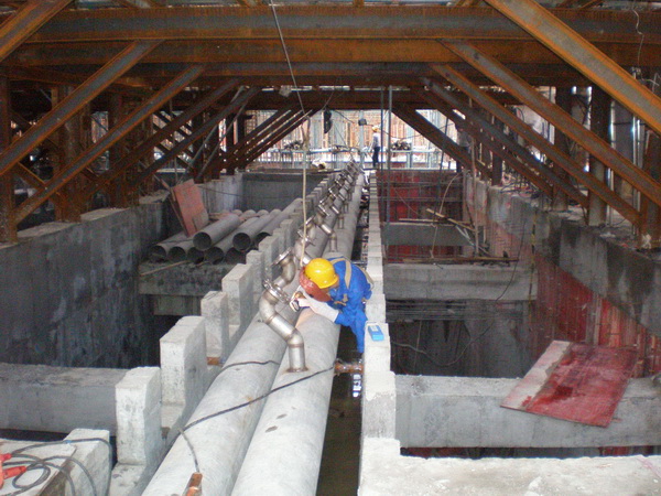 近日,由華南分公司承建的廣州市京溪污水處理廠施工進入高潮。該項目集污水收集、處理、凈化為一體,采用最先進的膜處理技術進行污水處理。同時該項目也為廣州亞運會配套項目,要求在6月30日具備接納污水能力。由于施工工期短、安裝量大、要求高,從廣東省、廣州市到區各級領導都相當關注。分公司對此項目也予以很高的重視和期望,選派有豐富施工管理經驗的陳岳剛擔任項目經理,在五月初組織精兵強將全面開始施工。施工中,由于土建施工尚未完成交接,我方安裝工程與土建的混凝土澆筑呈交叉作業,且長期的陰雨天氣導致地面層以下積水過多,潮濕陰暗,項目部克服一切困難,積極與土建單位協調,變被動為主動,給自己騰出施工空間。
