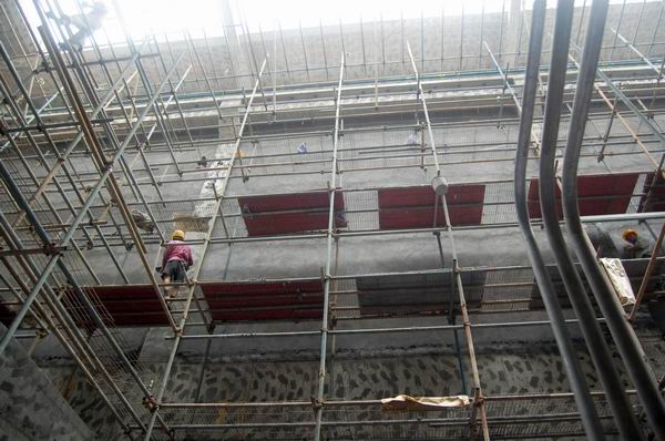 京溪污水工程系全地下施工,土建還有許多工作要同時做,拆摸、拆支撐架、拆臨時混凝土柱、砌墻、裝飾等,安裝在此交叉施工環(huán)境中進行,噪音、灰塵、潮濕、陰暗、悶熱、不通風、空間狹小。同時,交叉點多,安全要求高。只要有一個工作面,除了我們和土建,還有其他單位人員也要同時進行,消防、照明、通風、起重等,兩層地下室,每一層8-10米高,還有小型運料車輛進入。里面全是人,腳手架、孔洞,安全要求太大。而且,材料、設(shè)備搬運、吊裝困難。只有一個進出口,大的設(shè)備、材料要從吊裝口吊入,再通過自己因勢利導想的現(xiàn)場辦法才能運、移、吊裝到位。在里面吊車不能進,柱、梁也多,全靠人。有時一臺設(shè)備吊進去搬運安裝到位得要2天。