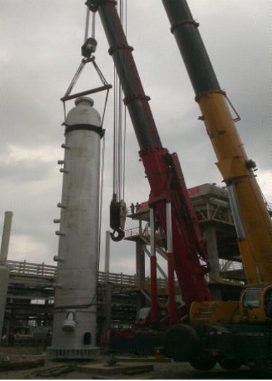 這樣的笑容來之不易。3臺反應器,最高的有19米多,單臺重量最大達到141余噸。總包單位在設計的時候未考慮吊耳。由于材質特殊,也無法在設備上施焊增加吊耳,這是最棘手的。總包單位束手無策,但又不同意項目部提出采用鋼絲繩捆綁式的吊裝方案,猶豫著不愿意簽字,萬一有個失誤,后果不堪設想!為了這次吊裝,江蘇分公司給予了大力支持,派出了經(jīng)驗豐富的起重吊裝專業(yè)工程師,多次到現(xiàn)場、到基地與總包單位反復論證方案的可行性。激烈的討論、嚴謹?shù)挠嬎恪㈩愃茦I(yè)績的展示……一次又一次的努力,項目部滿滿的信心和十足的把握最終讓總包單位同意了這個方案。