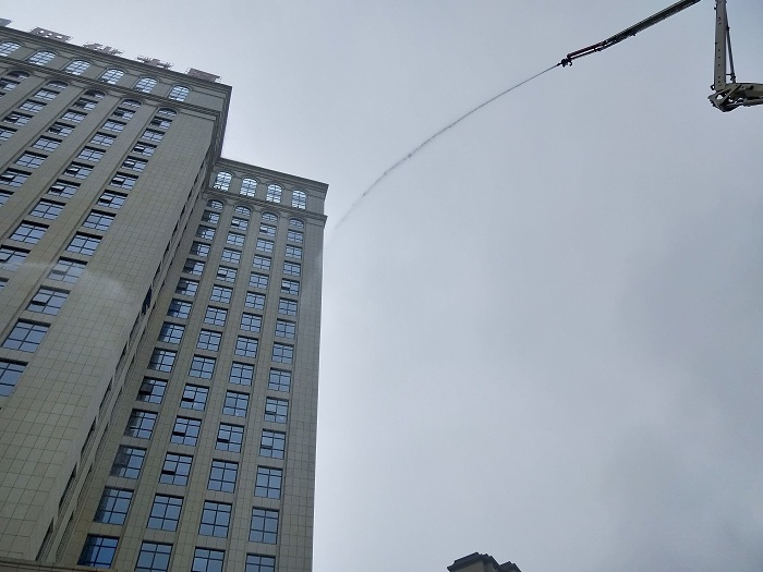 6月22日上午9時(shí)30分,四化大廈9樓濃煙滾滾,樓內(nèi)警鈴大作,員工們手拿濕毛巾,捂住口鼻從樓內(nèi)消防通道快速有序的撒離疏散到安全地帶,工作人員不時(shí)提醒疏散人員清點(diǎn)人數(shù),報(bào)告?zhèn)銮闆r和穩(wěn)定情緒。不到兩分鐘時(shí)間,兩臺(tái)消防車風(fēng)馳電掣的駛?cè)氪髲B院內(nèi),全副武裝的消防隊(duì)員快速啟動(dòng)消防裝備,分兩路進(jìn)行救援和滅火。不一會(huì)兒,樓內(nèi)滅火隊(duì)員和消防云梯車幾乎同時(shí)噴出水柱直達(dá)20樓頂。