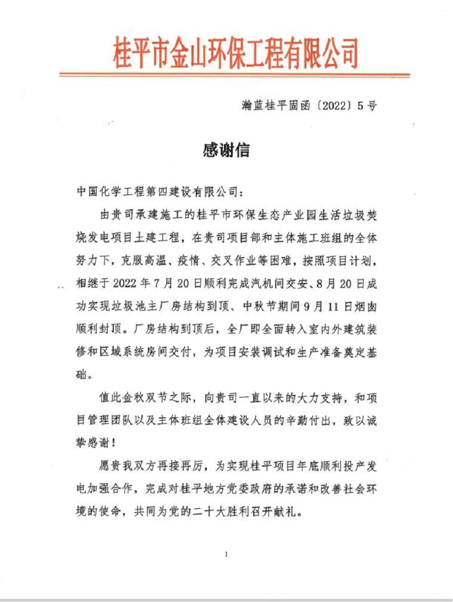 近日,由華南公司承建的桂平垃圾焚燒發(fā)電項目收到業(yè)主桂平市金山環(huán)保工程有限公司的感謝信,感謝公司的大力支持和項目團(tuán)隊、主體班組全體建設(shè)人員的辛勤付出。