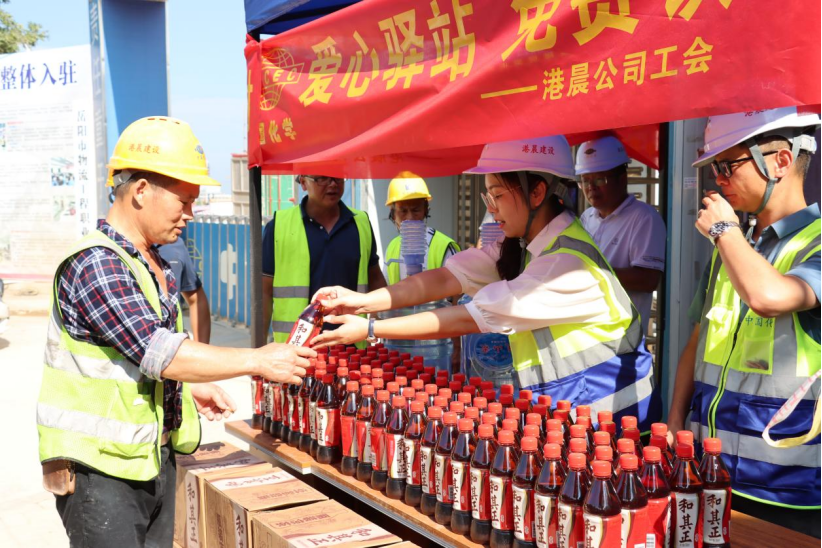 活動中,港晨公司工會為一線參建者們搭建了“愛心驛站”,驛站內配備防暑降溫物品、涼茶、礦泉水、冰棒,解決了一線工人在建設期間的飲水供給、納涼解暑等實際問題,切實打造了一線工人的“加油站”“歇腳地”。