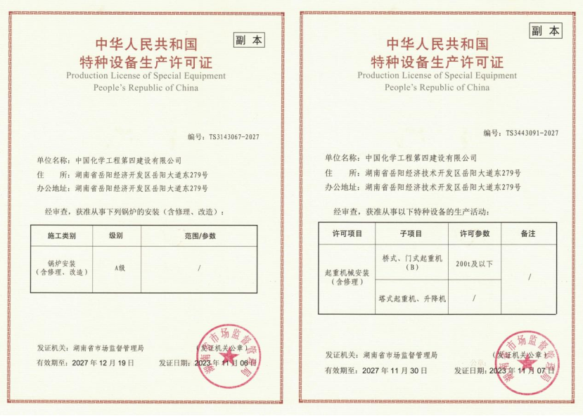 11月10日,公司收到湖南省市場監(jiān)督管理局頒發(fā)的鍋爐安裝(含修理、改造)最高資質(zhì)(A級)證書和起重機械安裝(含修理)資質(zhì)證書,標(biāo)志著公司鍋爐安裝和起重機械安裝許可證延續(xù)換證工作圓滿完成。