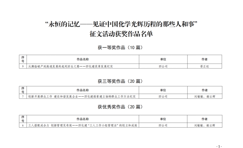 2020年3月以來,集團(tuán)公司組織開展了“永恒的記憶——見證中國(guó)化學(xué)光輝歷程的那些人和事”征文活動(dòng)。該活動(dòng)得到了公司職工的積極響應(yīng),共向集團(tuán)上報(bào)8篇征文作品。其中由公司工會(huì)主席胥正旺撰寫的征文《從瀕臨破產(chǎn)到高速發(fā)展的起死回生之路——四化建改革發(fā)展紀(jì)實(shí)》榮獲一等獎(jiǎng),由公司黨群工作部主任劉敏敏、《四化建簡(jiǎn)報(bào)》執(zhí)行主編謝云輝共同撰寫的征文《創(chuàng)新開展群眾工作 建設(shè)和諧發(fā)展企業(yè)——四化建探索建立獨(dú)特群眾工作方法紀(jì)實(shí)》《三人搭配成合力 創(chuàng)新管理見奇效——四化建“三人工作小組管理法”的創(chuàng)立和成效》分別榮獲三等獎(jiǎng)和優(yōu)秀獎(jiǎng),并先后在中國(guó)化學(xué)微信公眾號(hào)和《中國(guó)化學(xué)報(bào)》刊登。