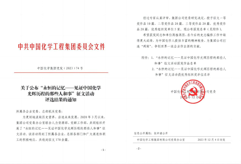 12月4日,中國(guó)化學(xué)工程集團(tuán)有限公司發(fā)文公布“永恒的記憶——見證中國(guó)化學(xué)光輝歷程的那些人和事”征文活動(dòng)評(píng)選結(jié)果,公司三篇作品分別榮獲一等獎(jiǎng)、三等獎(jiǎng)和優(yōu)秀獎(jiǎng)。
