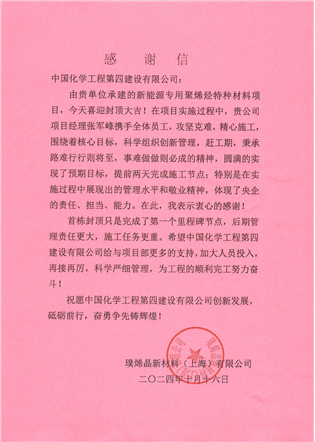華東公司上海璞烯晶新材料項(xiàng)目收到業(yè)主感謝信