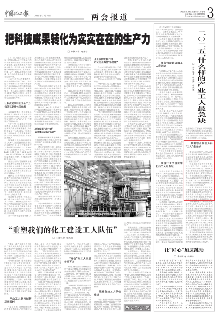 3月10日,中國(guó)化工報(bào)以《二O二五,什么樣的產(chǎn)業(yè)工人最急缺》為題報(bào)道周鴻的建議。