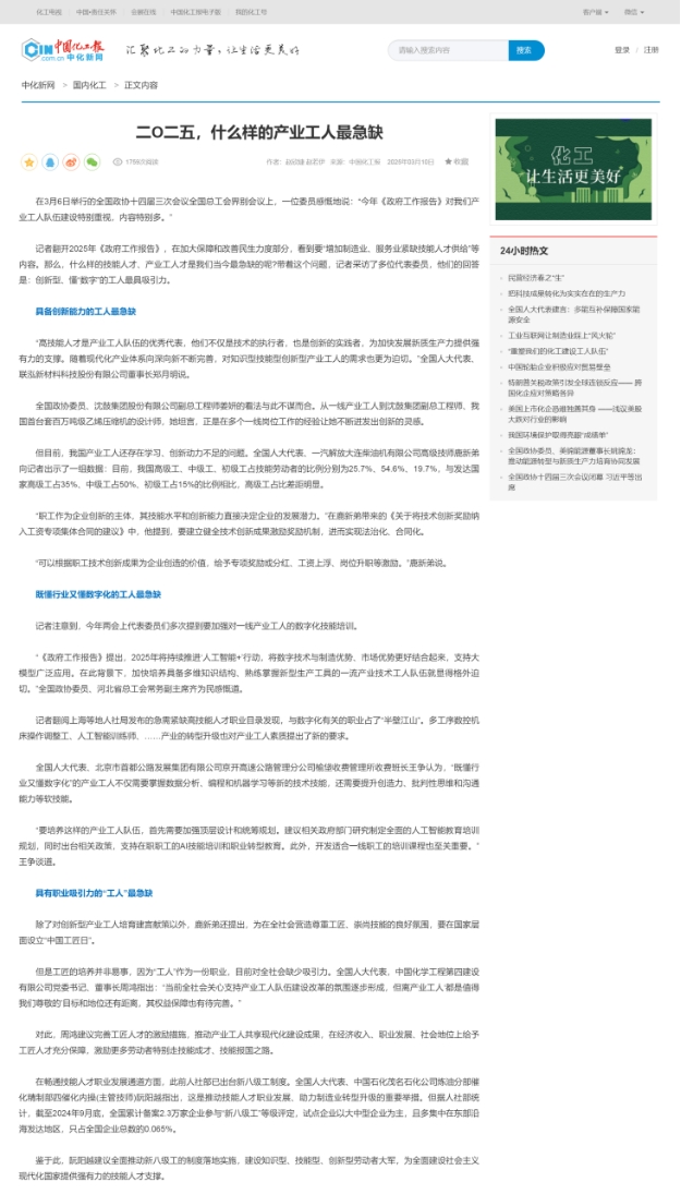 3月10日,中化新網(wǎng)以《二O二五,什么樣的產(chǎn)業(yè)工人最急缺》為題報(bào)道周鴻的建議。