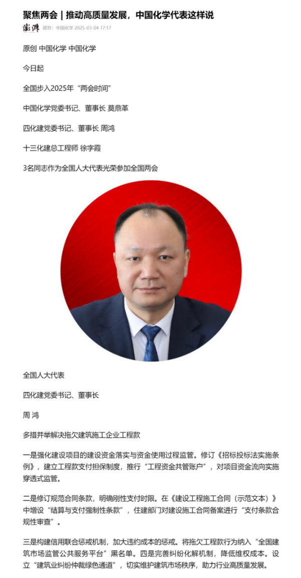 2025年全國(guó)兩會(huì)期間,全國(guó)人大代表,中國(guó)化學(xué)四化建黨委書(shū)記、董事長(zhǎng)周鴻向大會(huì)提交《關(guān)于加強(qiáng)產(chǎn)業(yè)工人隊(duì)伍建設(shè)的建議》《關(guān)于多措并舉解決拖欠建筑施工企業(yè)工程款的建議》《關(guān)于推動(dòng)洞庭湖區(qū)常岳九鐵路、荊岳鐵路、監(jiān)利至華容至益陽(yáng)鐵路規(guī)劃建設(shè)提速的建議》《關(guān)于修改最高法院〈關(guān)于大型企業(yè)與中小企業(yè)約定以第三方支付款項(xiàng)為付款前提條款效力問(wèn)題的批復(fù)〉的建議》等4條建議,受到主流媒體深入報(bào)道,引起社會(huì)各界廣泛關(guān)注。