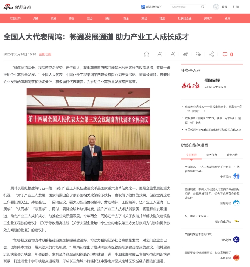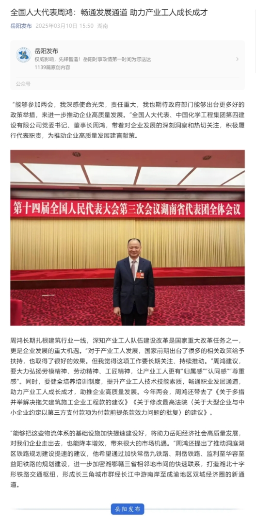 3月10日,岳陽(yáng)日?qǐng)?bào)·岳陽(yáng)發(fā)布微信公眾號(hào)以“全國(guó)人大代表周鴻:暢通發(fā)展通道 助力產(chǎn)業(yè)工人成長(zhǎng)成才”為題報(bào)道周鴻參加2025年全國(guó)兩會(huì)。