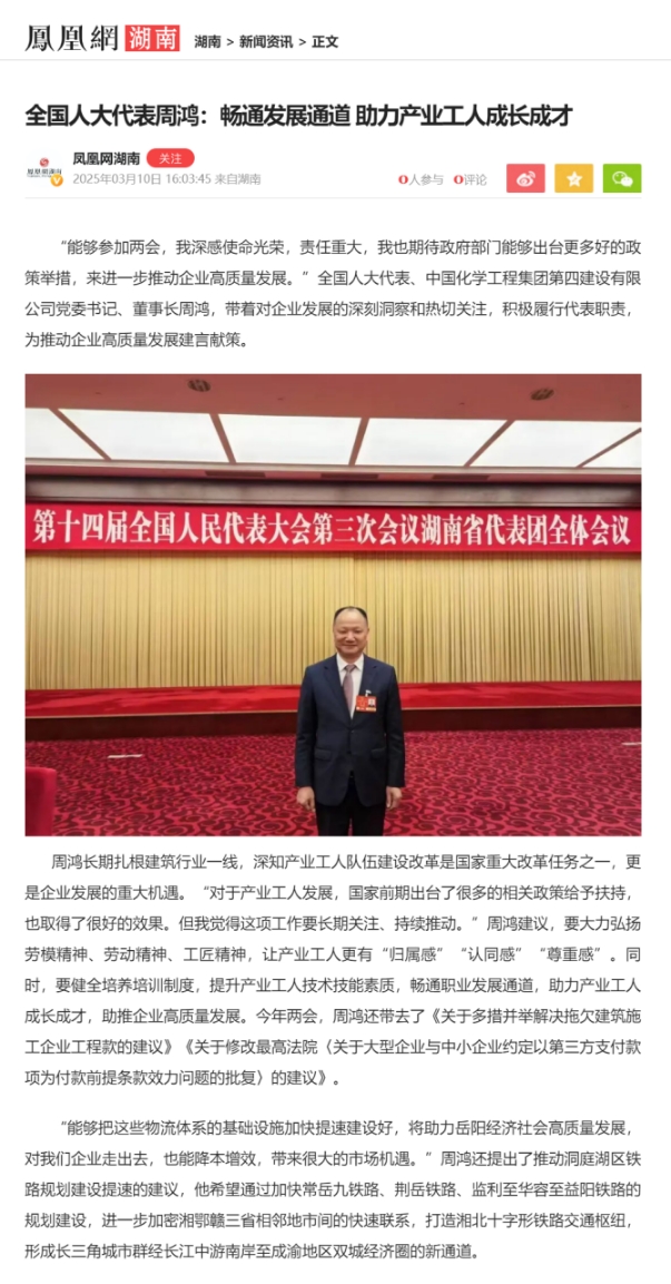 3月10日,鳳凰網(wǎng)湖南頻道以“全國(guó)人大代表周鴻:暢通發(fā)展通道 助力產(chǎn)業(yè)工人成長(zhǎng)成才”為題報(bào)道周鴻參加2025年全國(guó)兩會(huì)。