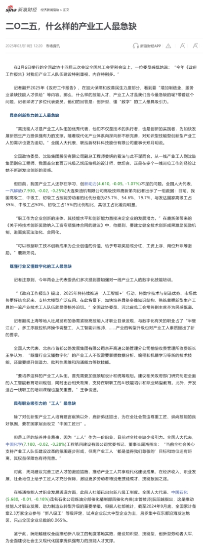 3月10日,新浪網(wǎng)以《二O二五,什么樣的產(chǎn)業(yè)工人最急缺》為題報(bào)道周鴻的建議。