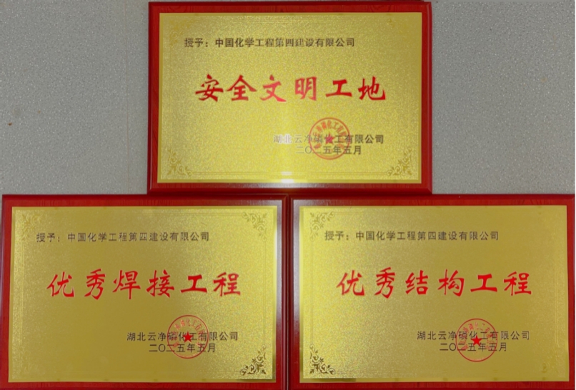 近日,由中南公司承建的湖北云凈磷化工有限公司40萬噸/年濕法凈化磷酸項目一期工程收到業(yè)主頒發(fā)的“安全文明工地”“優(yōu)秀焊接工程”“優(yōu)秀結(jié)構(gòu)工程”三塊獎牌及感謝信,業(yè)主高度贊揚項目團隊展現(xiàn)出的卓越專業(yè)素養(yǎng)、頑強攻堅精神與強烈責(zé)任擔(dān)當(dāng)。
