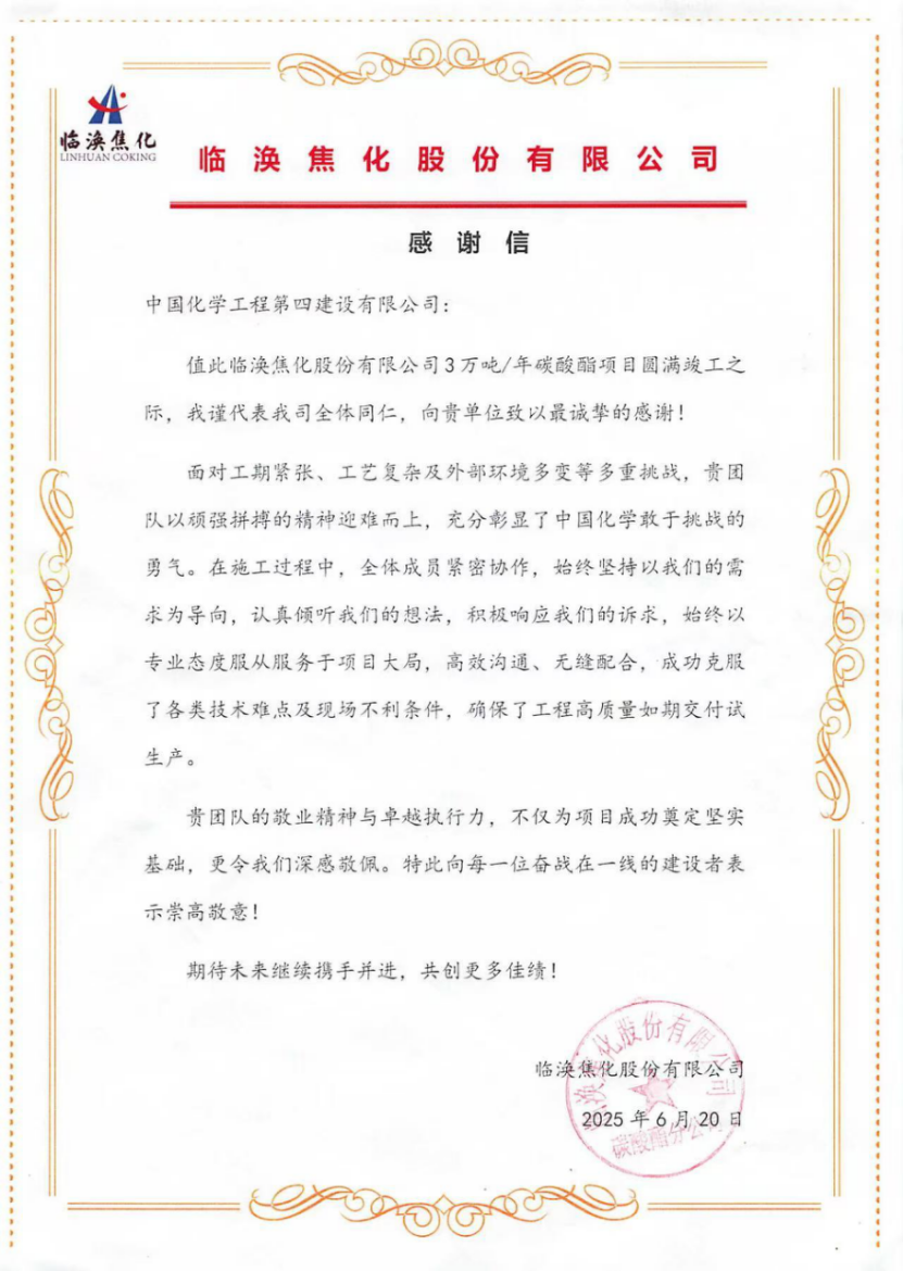 近日,西部公司臨渙焦化碳酸酯項目部收到臨渙焦化股份有限公司發來的感謝信,信中對西部公司在臨渙焦化股份有限公司3萬噸/年碳酸酯項目建設中的突出表現給予高度贊揚和衷心感謝。