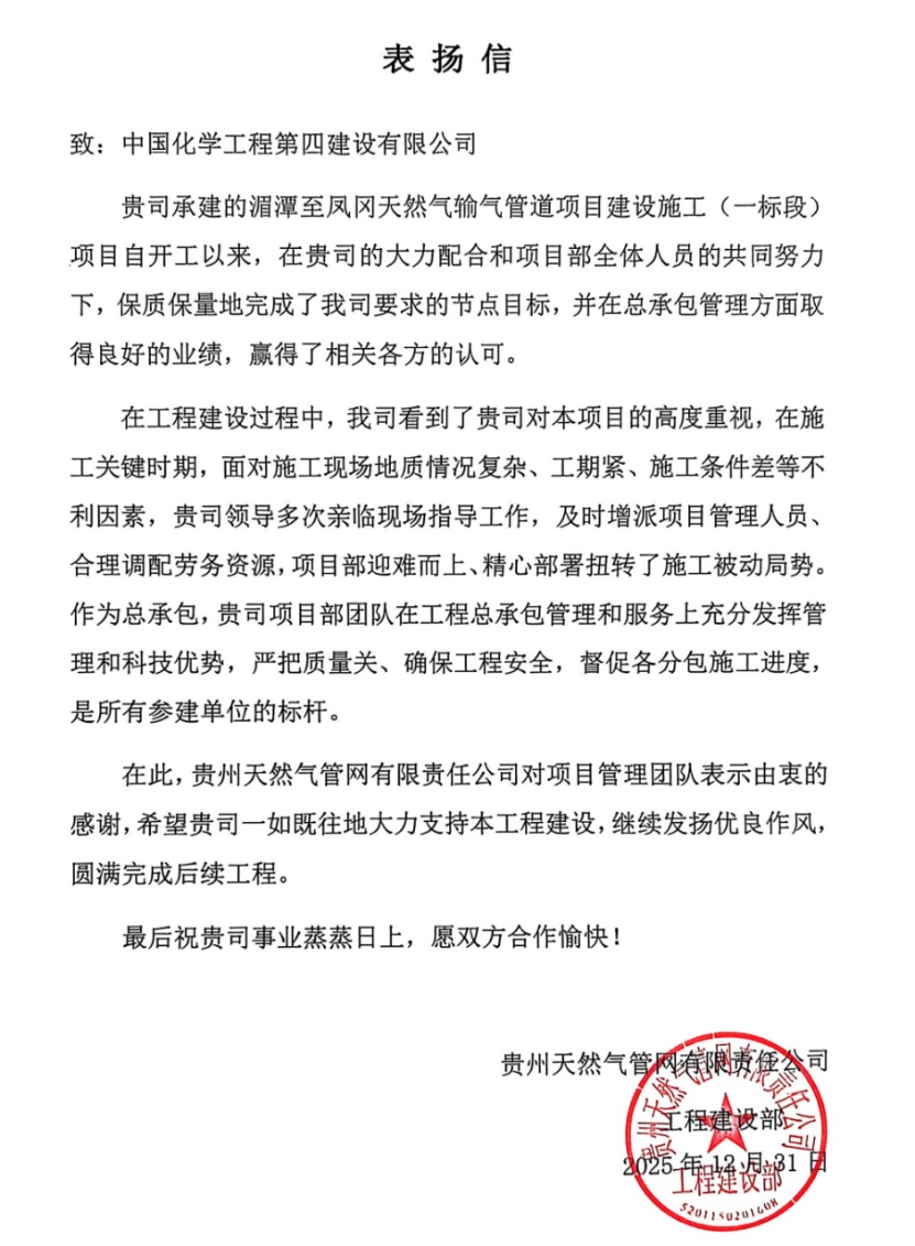 西部公司湄潭至鳳岡天然氣管道項目獲業主來信表揚