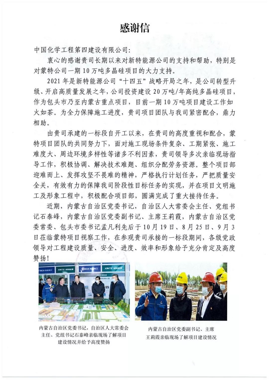 10月25日,西部分公司收到內(nèi)蒙古新特硅材料有限公司《感謝信》。