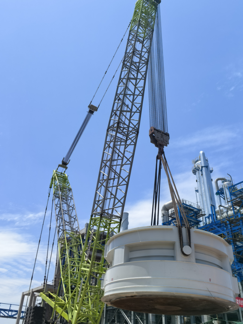 這兩臺(tái)設(shè)備中的4R101氧化反應(yīng)器直徑9.1米、高4.4米、中間段凈重410噸, 4R102氧化第二反應(yīng)器凈重390余噸。面對(duì)設(shè)備體積龐大、現(xiàn)場(chǎng)作業(yè)空間受限及風(fēng)力不穩(wěn)定等難題,項(xiàng)目團(tuán)隊(duì)采用單機(jī)抬吊工藝,主吊選用650噸履帶吊搭配310噸超起配重,制定詳細(xì)預(yù)案進(jìn)行模擬演練。吊裝過(guò)程中,技術(shù)人員全程監(jiān)測(cè)風(fēng)速、設(shè)備姿態(tài)及受力數(shù)據(jù),歷時(shí)兩天將這兩臺(tái)巨型設(shè)備毫米級(jí)精準(zhǔn)吊裝就位,受到業(yè)主的一致好評(píng)。