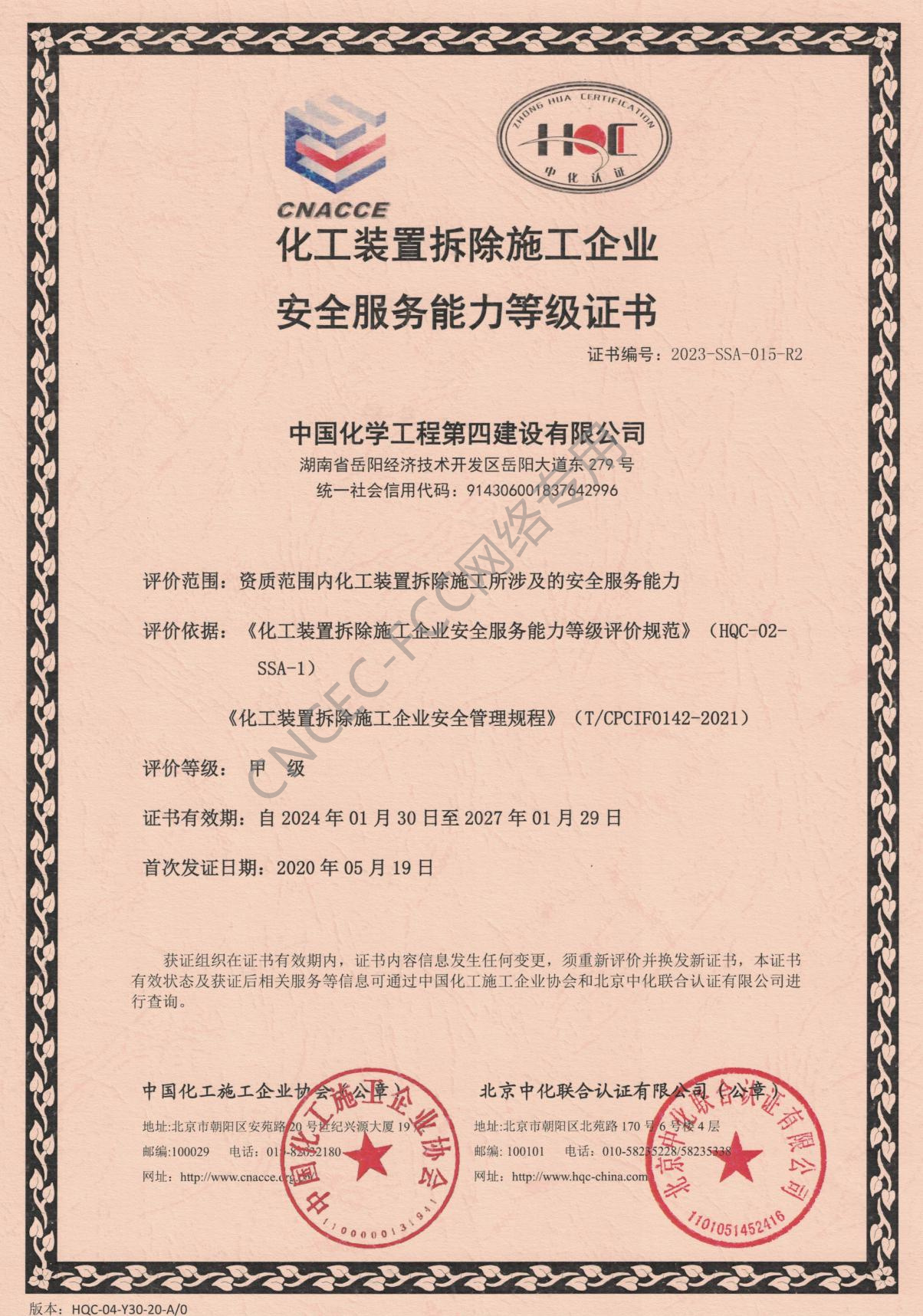 化工裝置拆除施工企業(yè)安全服務能力等級證書